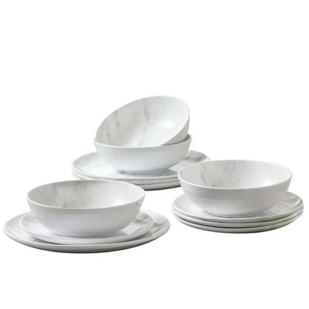Add style to your dinnerware collection with this Grey and White Marble print Melamine 12-Piece Dinnerware Set by Better Homes & Gardens. The realistic marble print makes this durable tableware collection perfect for your indoor or outdoor entertaining needs while adding a luxury look. These cereal bowls have the appearance and feel of ceramic but are made with the lightweight durability of Melamine. This is the perfect set for kids and adults alike and great for everyday functionality. With four dinner plates, four dinner bowls with 36-ounce capacity, and four salad plates, these are perfect for enjoying a meal at home, whether it's a salad, cereal or spaghetti. Family friendly melamine is BPA-free and safe for use in the top rack of your dishwasher. Complete your table setting with coordinating dinnerware and serving pieces available for purchase.