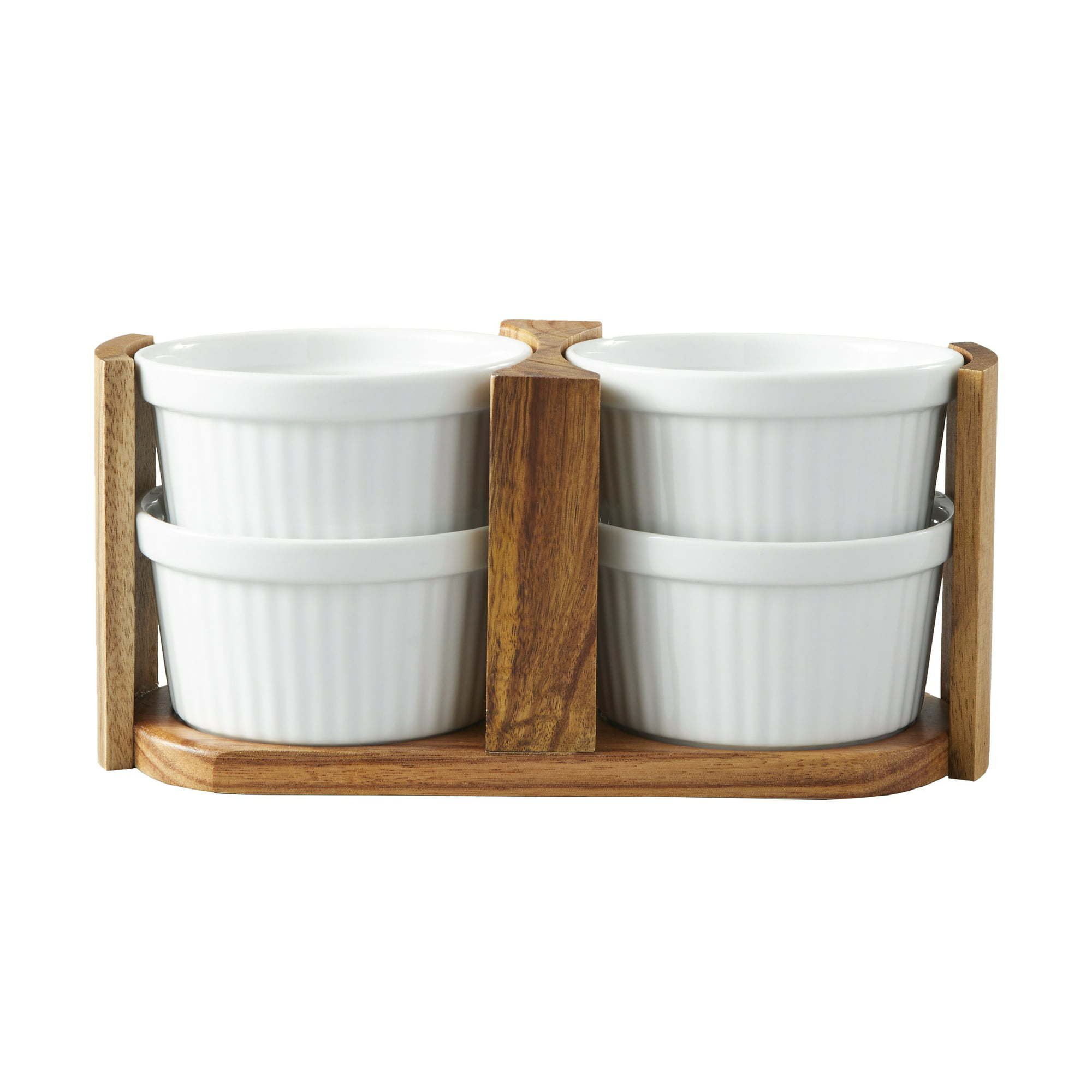 The Better Homes & Gardens Acacia Wood Ramekin Caddy Set is a perfect addition to your kitchen. These sleek porcelain ramekins paired with a wooden caddy are perfect for baking and serving your favorite oven-to-table recipes to your friends and family. Whether you're baking individual portions of desserts like chocolate mousse and Crème Brule, these ramekins are sure to make an impression on your guests. The 1.12 pound wooden caddy allows these ramekins to be easily stored away or displayed on the counter. The porcelain ramekins are dishwasher and microwave safe for ease of use. As versatile as they are appealing, the Better Homes & Gardens Acacia Wood Ramekin Caddy Set is sure to be a wonderful addition to your bakeware or serveware collection.