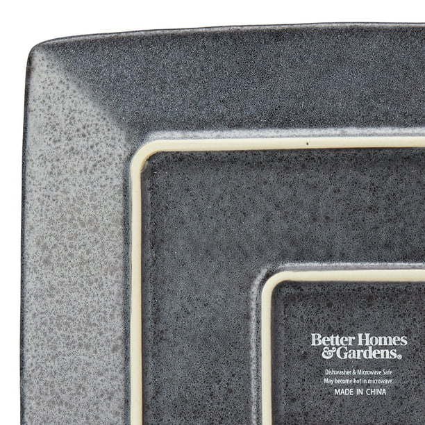 Make a bold style statement with the Better Homes & Gardens Dark Gray Square-Shaped Salad Plate. Crafted with strong, durable stoneware material, this salad plate turns any table setting into a cool, edgy masterpiece. Finished in dark gray with unique mottled details, courtesy of the reactive glaze finish, this everyday essential adds an artistic flair to your kitchen and dining room decor. You'll love how easily this modern salad plate elevates any dining experience. Plus, this set's not only easy on the eyes — it's also easy to care for. This plate is microwave and dishwasher safe to easily heat up leftovers and simplify post-meal cleanup.