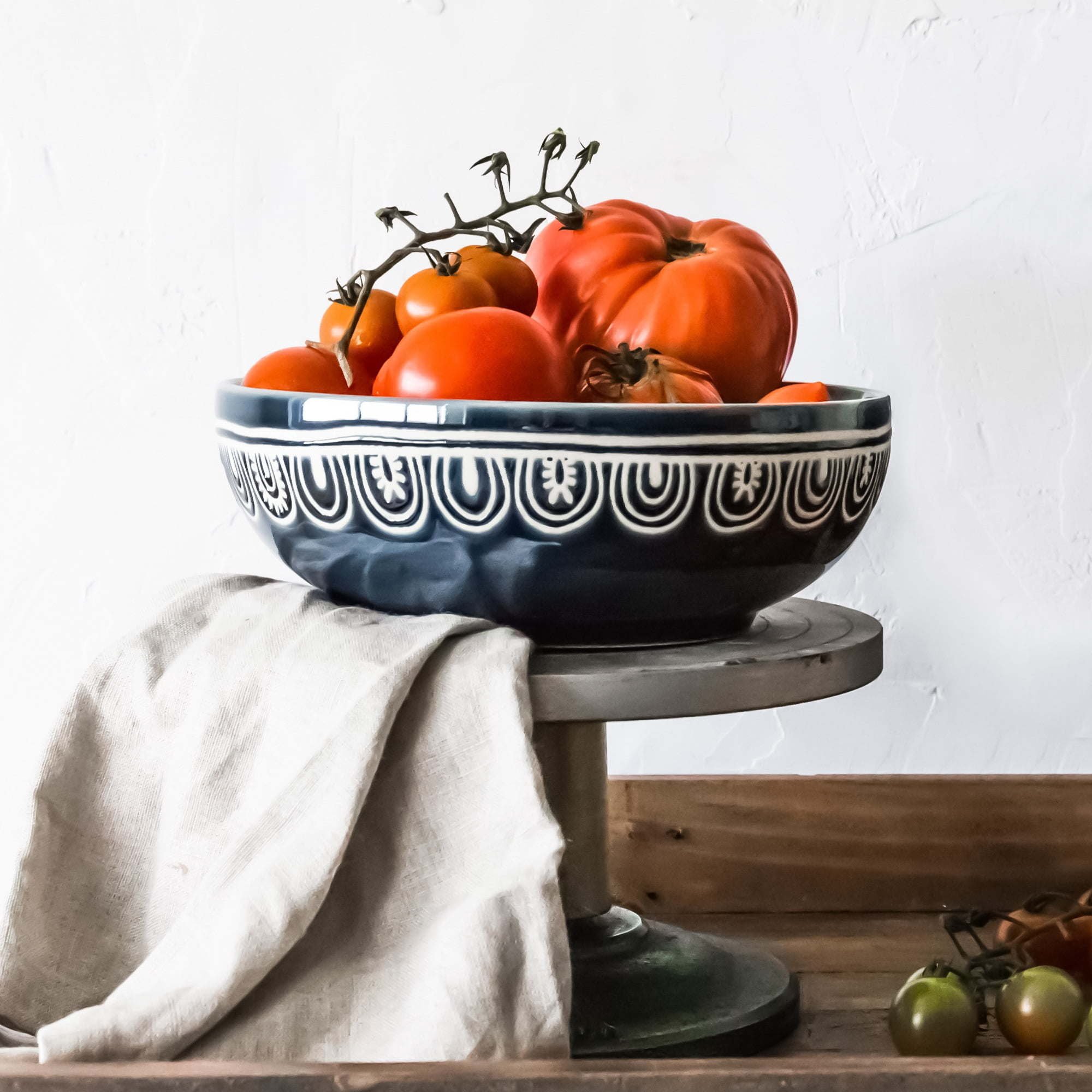 Make even everyday tablescapes look and feel more special this Better Homes and Gardens serve bowl that compliments almost any kitchen. This stunning bowl features an intricate pattern in raised white ceramic glaze against a smoky teal background on the exterior and white glaze on the interior. It will make even simple meals more exotic. This medium sized serve bowl will add style to your table when mixed with Better Homes and Gardens Teal medallion dinnerware and the white porcelain dinnerware as well. Stoneware is durably crafted for everyday use and it is dishwasher, microwave and freezer safe. There is also a serve platter available with this series, sold separately. Item ships in a re-shipper for safety and does not come in a gift box.