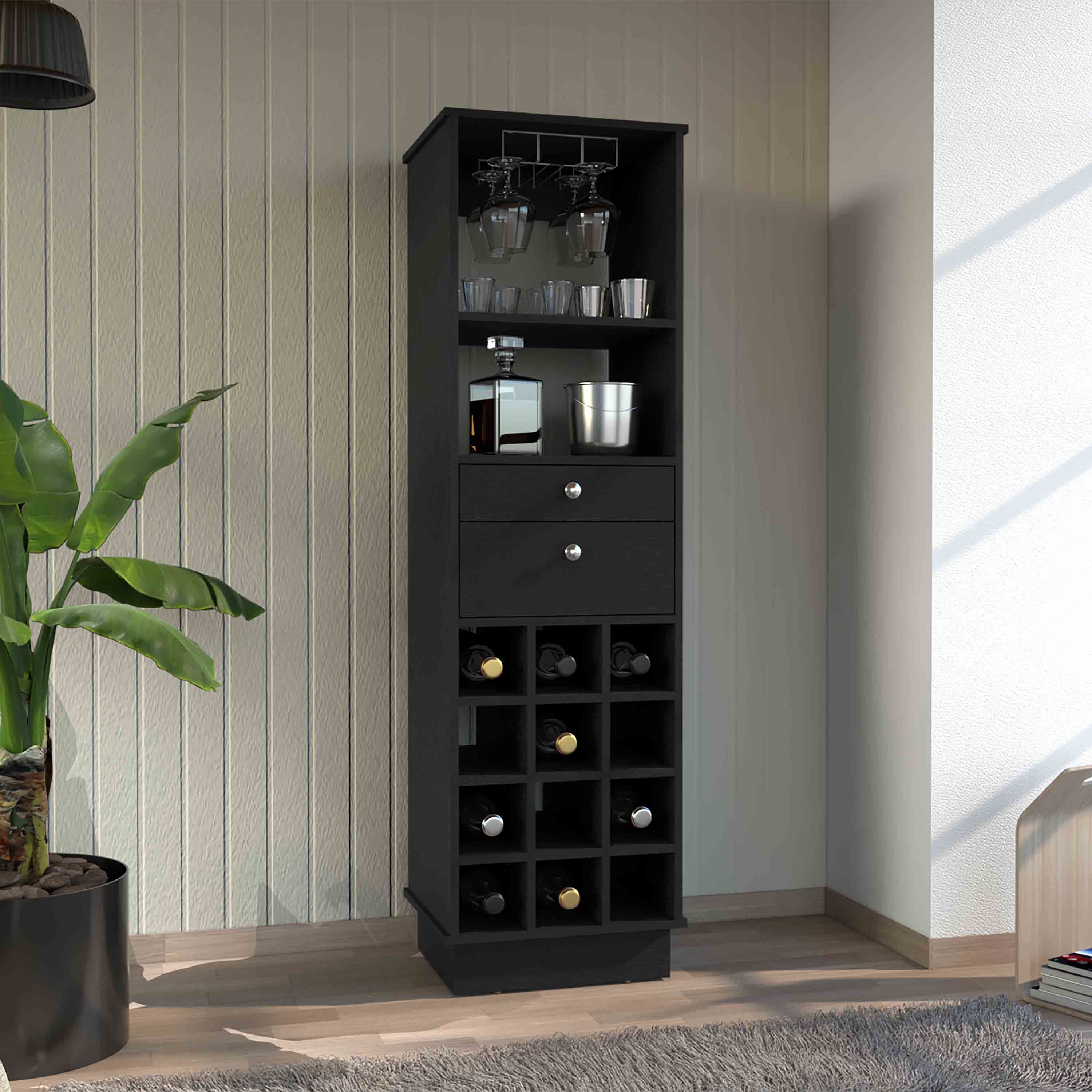 Classic Bar Cabinet, Two Drawers, Twelve Built-in Wine Rack-Black