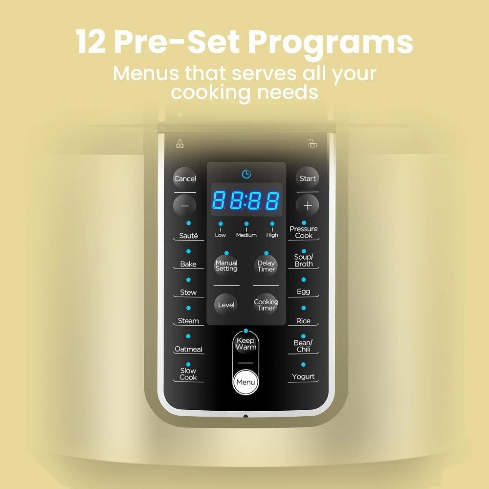 • Quick One Touch Kick Start with 12 Preset Smart Programs- Electric Pressure Canner, sauté, bake, stew, steam, oatmeal, slow cook, soup/ broth, egg, rice, bean/chili, yogurt