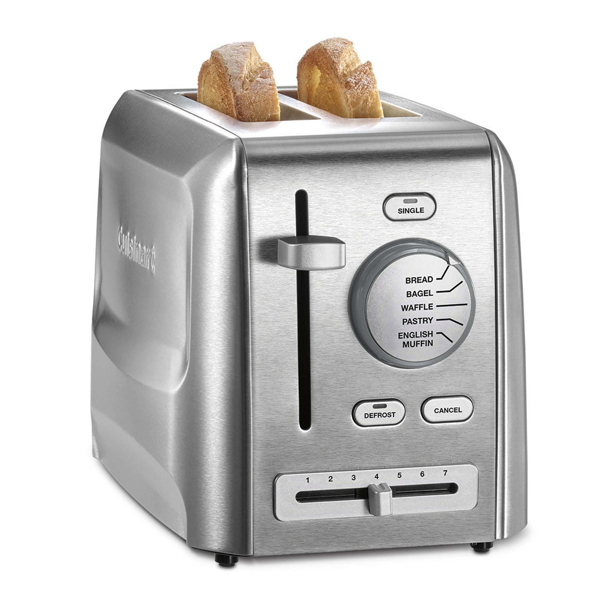 Whip up some delicious toast with ease using the stylish Cuisinart 2-Slice Toaster. It features seven shade settings and toast options for bread, bagels, English muffins, frozen waffles, and pastry. The silver toaster also features a pull-out crumb tray, stainless housing, large intuitive controls and defrost setting all with 900 watts of power providing excellent results. Add it to your countertop today or give it as a practical and useful housewarming gift. It fits easily in with other appliances and decor, making it a suitable choice for almost any modern kitchen.