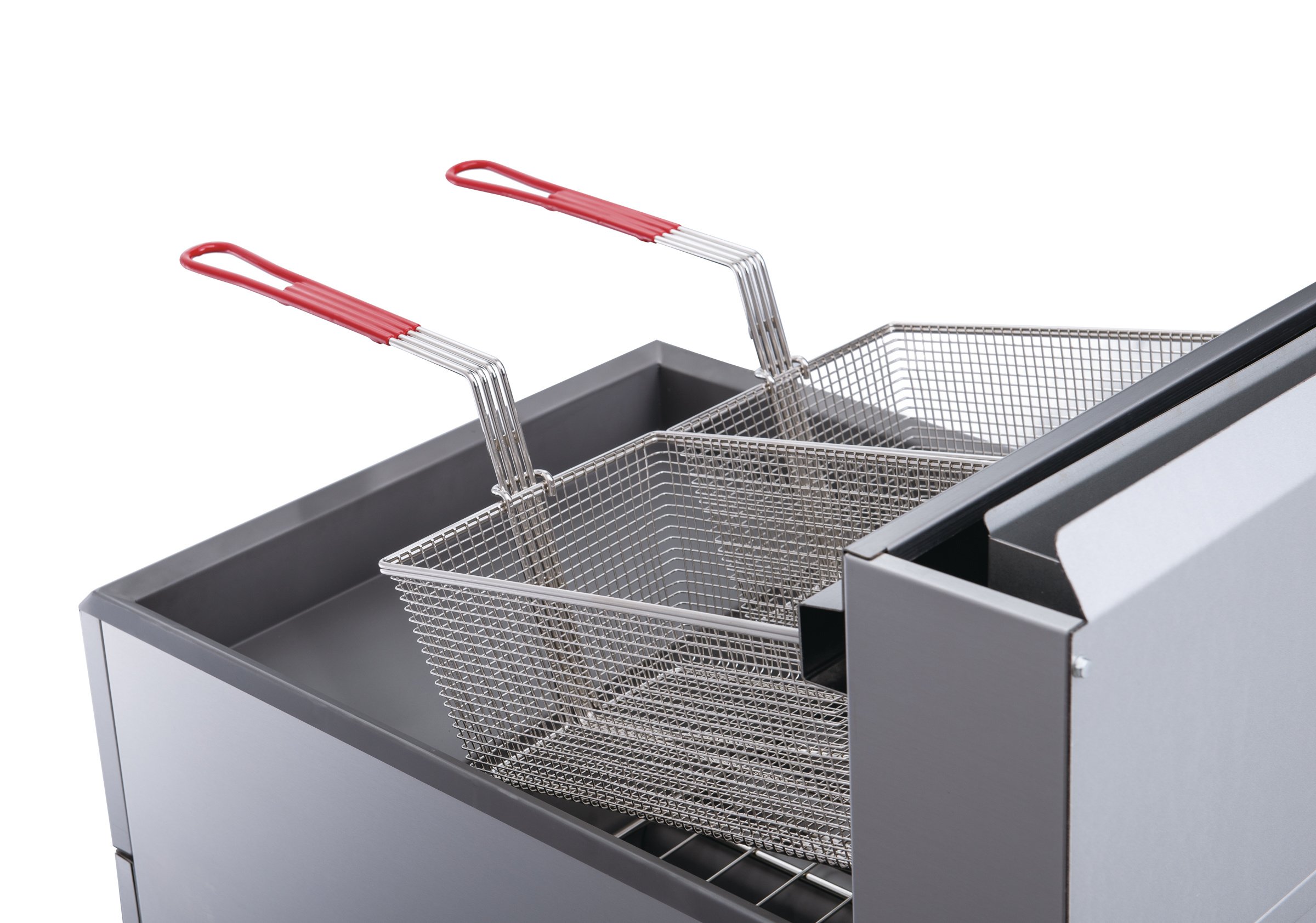 The high efficiency, cast iron burners create a large heat-transfer area forreliable, even heat distribution. Our durable temperature probe senses temperaturechanges and activates a quick burner response. The temperature for all the Dukersfryers goes from 200°F (93°C) to 400°F (204°C). Includes Millivolt safety controlsystem. Every inch of the frypot and cold zone can be cleaned and wiped down byhand. The large cold zone and forward sloping bottom help collect and removesediment from the frypot to safeguard oil qualityand support routine frypot cleaning.