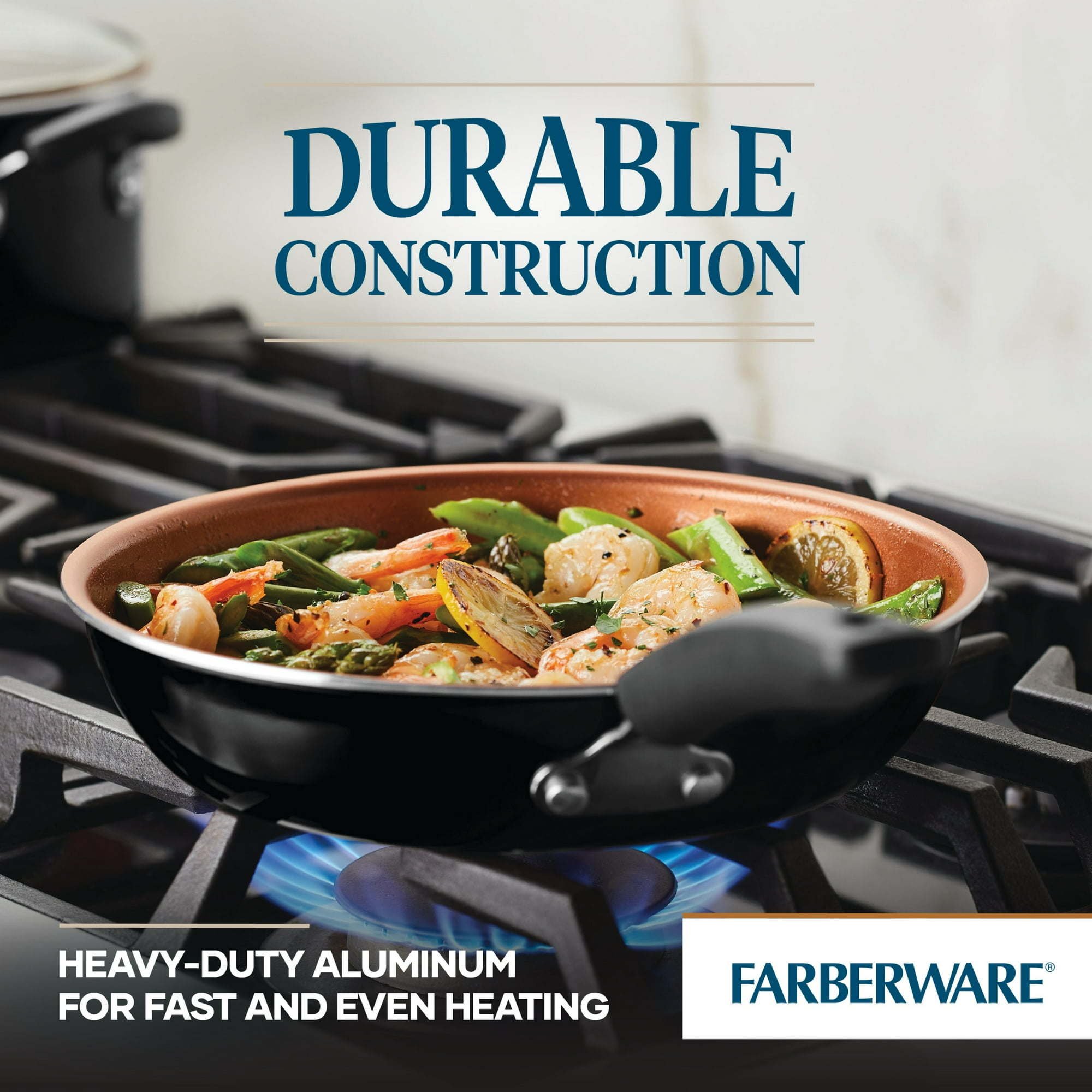 Equip the kitchen with the quality performance of Farberware’s Easy Clean Pro Ceramic Nonstick Cookware Set. Durable aluminum cookware is designed for quick, even heating so family meals are ready in no time. Pots and pans are finished with top-quality nonstick for effortless food release and are dishwasher safe for quick and easy cleanup.