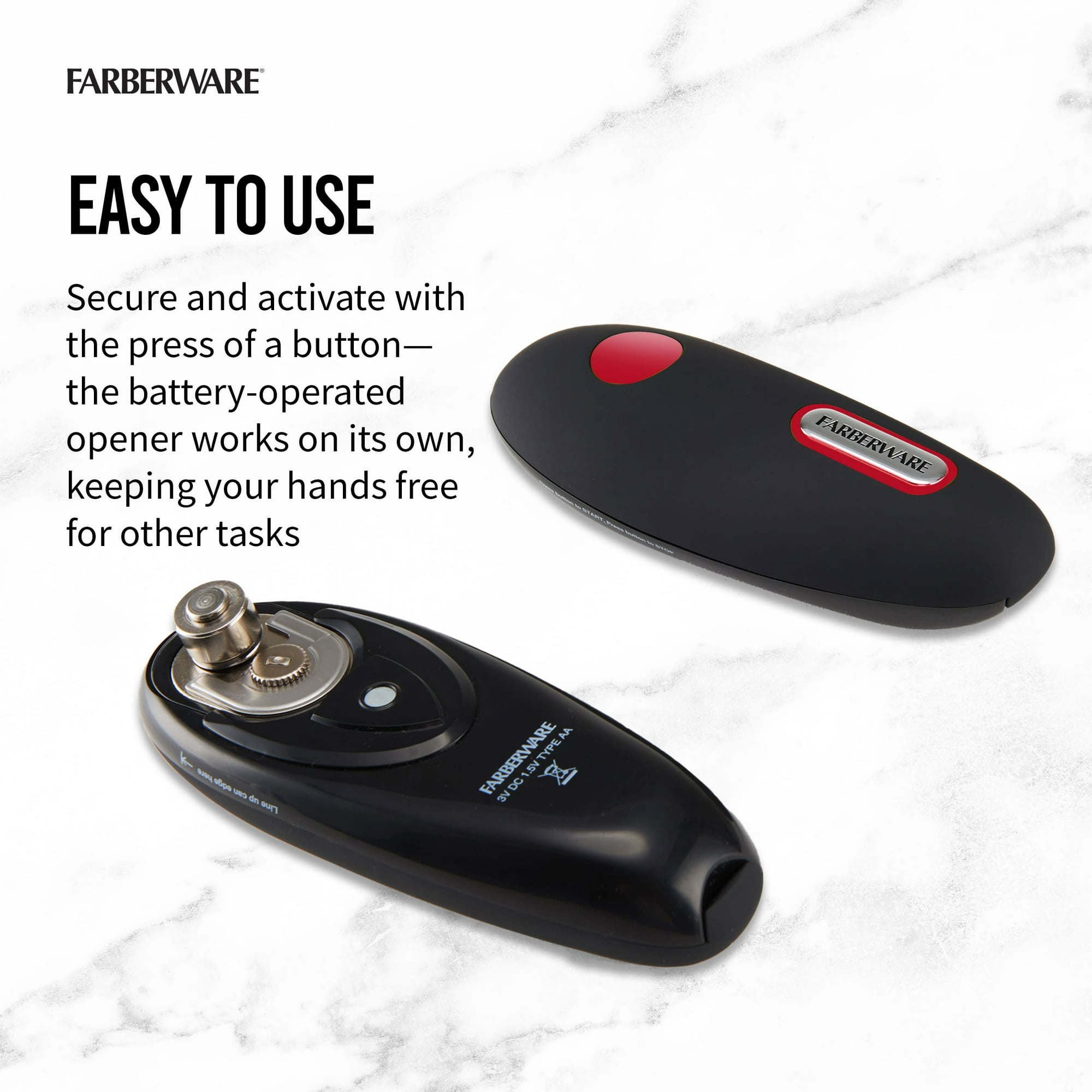 Make meal preparation simpler with this Farberware Hands-Free Battery Operated Can Opener. It has a compact size that is easy to work with and store when not being used. The Farberware can opener has a black and red design that adds a modern touch to your kitchen. It has a sturdy blend of materials that is safe for daily use. It operates on batteries (sold separately). This tool can make a handy gift option for a housewarming. It will operate at the touch of a button.