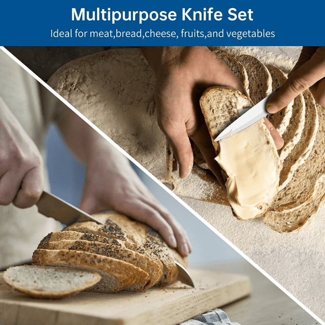 This steak knives set for kitchen is easy to maintain. Dishwasher safe. Perfect for storage after washing and drying. The whole body of the knives set for kitchen is made of premium stainless steel material. The surface layer has a high-grade anti-rust coating, which will not rust as easily as other kitchen knife sets.