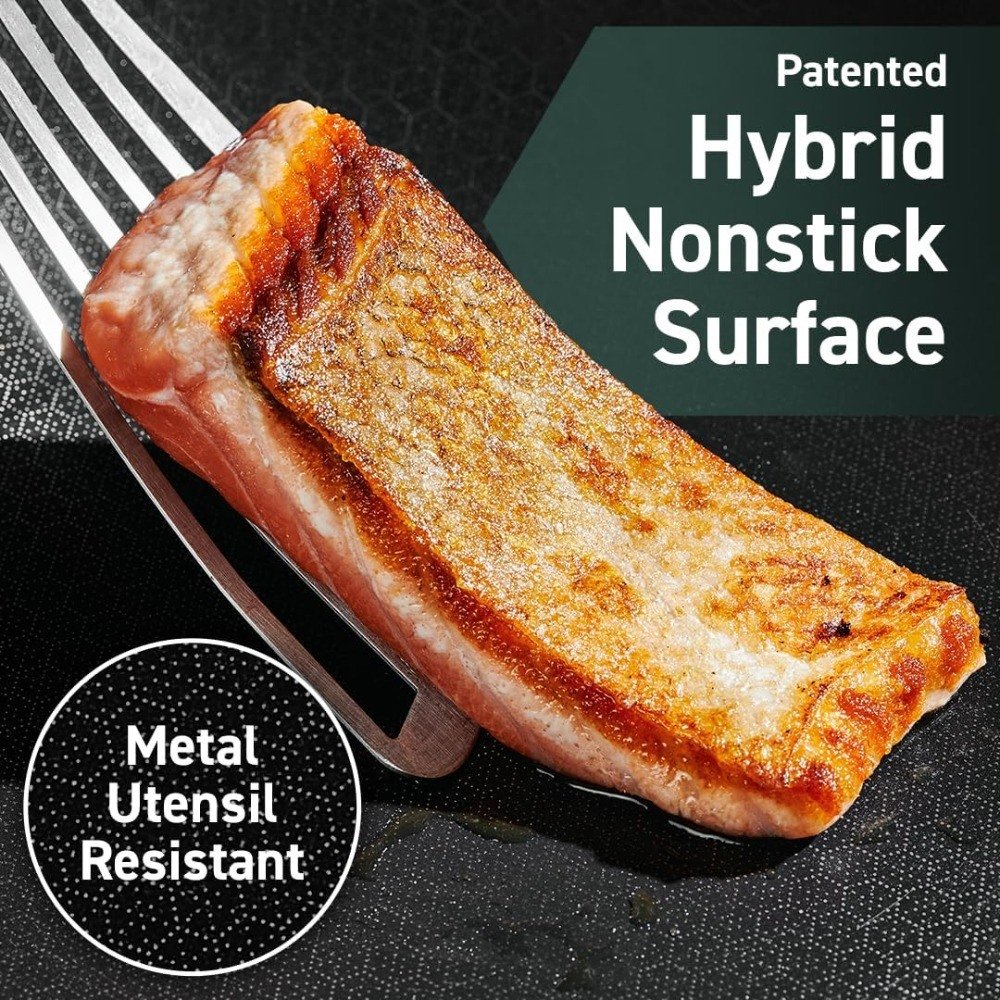 •  patented hybrid tech utilizes tri-ply construction – aluminum between two layers of stainless-steel - laser-etched with our hexagonal nonstick surface to deliver the searing power of stainless, durability of cast-iron and easy cleanup of nonstick.