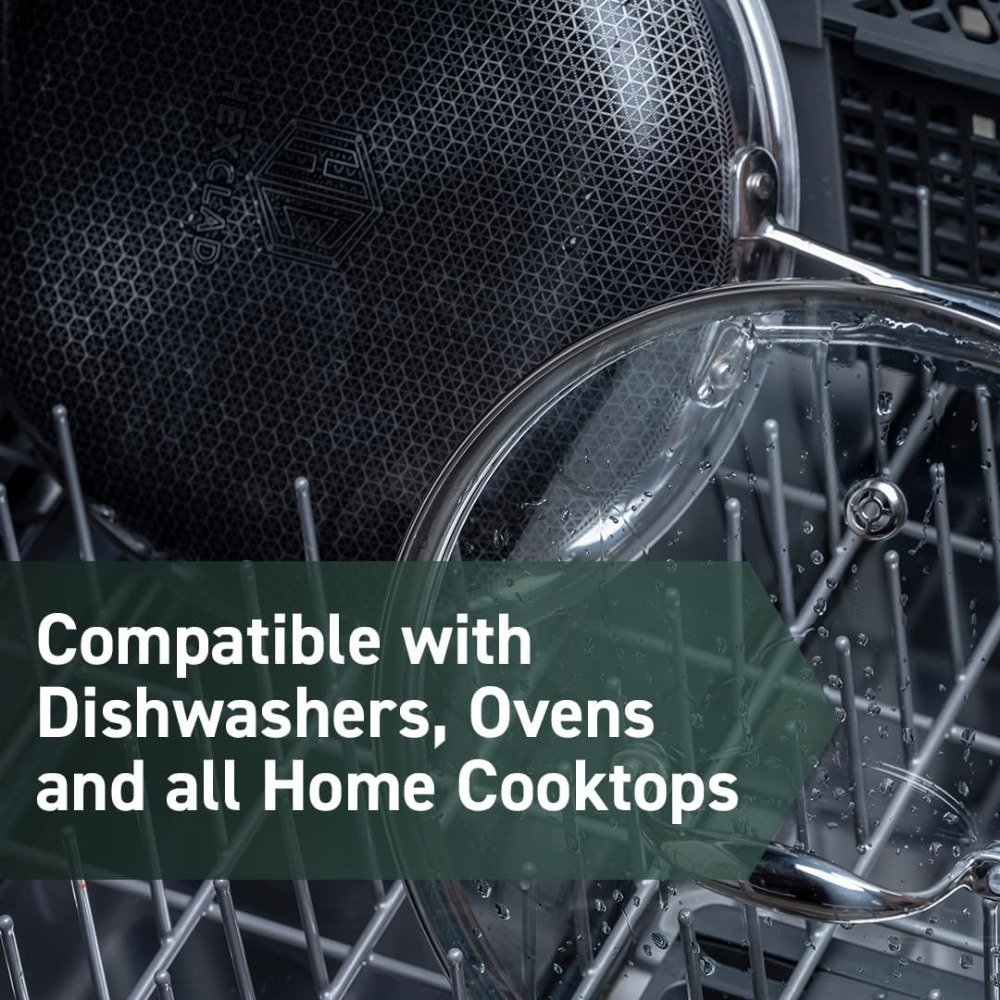 • Use your  cookware on any home cooktop or stovetop, including induction. Every piece is also scratch-resistant, dishwasher-safe, and oven-safe up to 500°F. (Lids are oven-safe up to 400°F.)