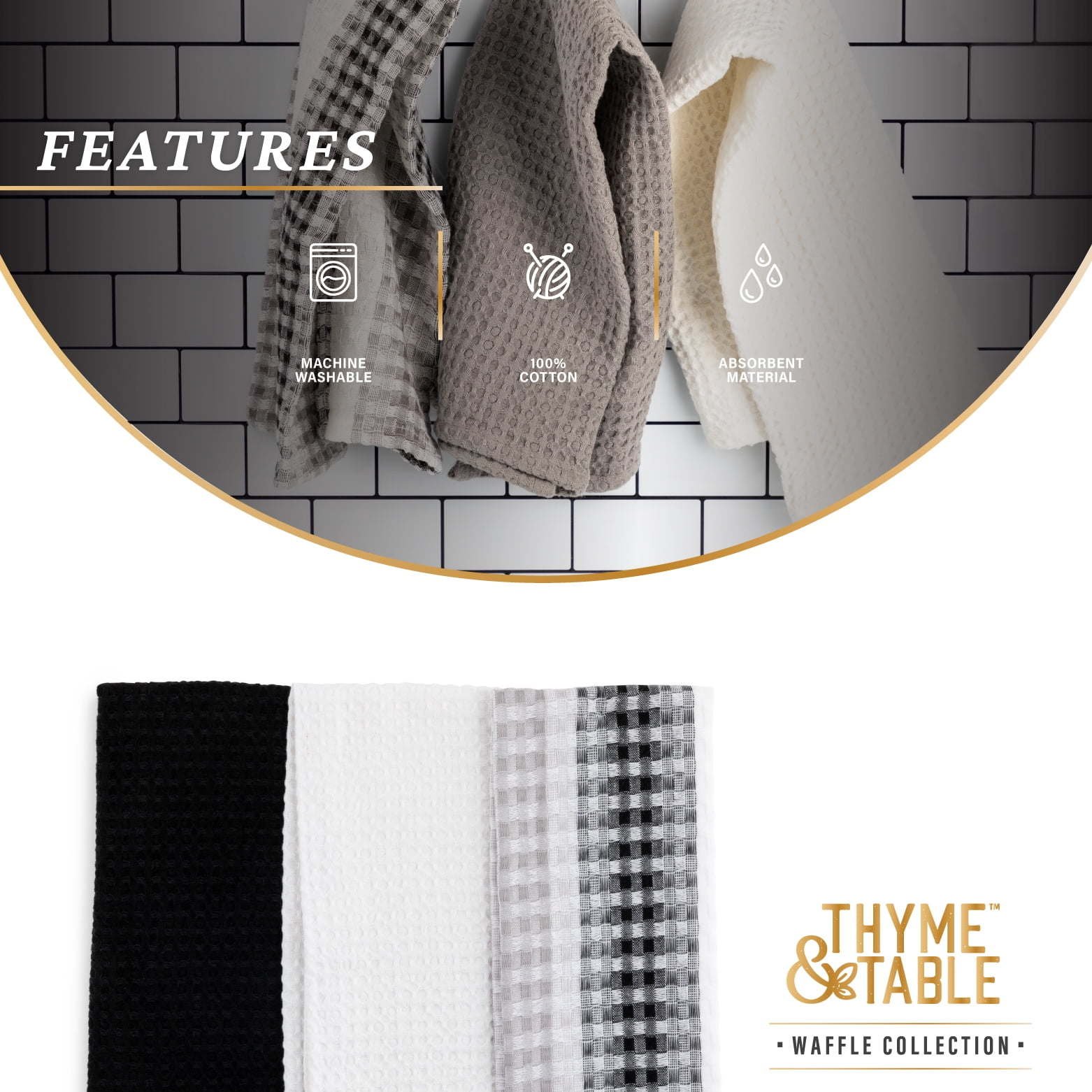 Thyme & Table Cotton Waffle Kitchen Towels, Black White, 3-Piece Set is a part of Thyme & Table's Waffle Collection. These kitchen towels are soft and durable and are made of 100% absorbent waffle cotton material. The cotton towels are machine washable and will be long lasting. The towels measure 28" x 16". With a waffle texture, these towels are stylish and functional. Care and use: wash separately before first use with like colors. Use mild detergant and tumble dry low. Do not bleach. Warm iron if needed.